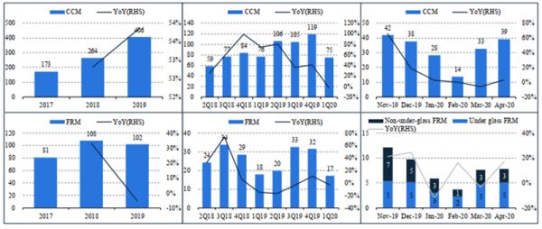丘钛 4 月出货量同比:手机摄像模组+3.4%,指纹模组+17.0%。2020 年 4 月,丘钛科技手机摄像模组出货 39.2 百万颗,环比+19.8%,同比+3.4%,环比提升有客户项目周期的影响;指纹识别模组出货 7.9 百万颗,环比+3.2%,同比+17.0%。