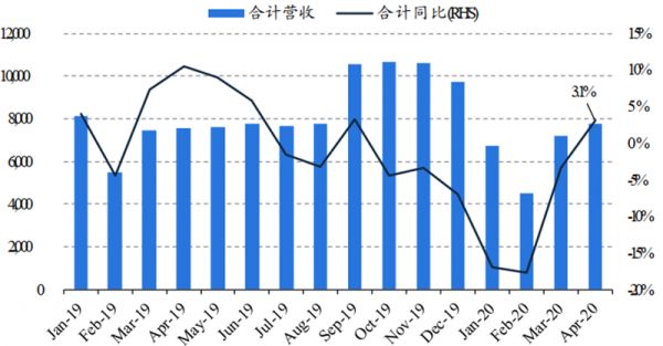 据信通院,2020 年 4 月,国内手机出货 4173 万部(+14.2%);1-4 月累计出货 9068万部(-20.1%)。回顾一季度,国内 1 月/2 月/3 月出货 2081/638/2176 万台,分别同比下滑 39%/56%/23%,一季度累计出货 4895 万部(-36.4%)。一季度的大幅下滑主要是 COVID-19 在国内爆发的影响,随着疫情在 3 月得到控制,3 月份降幅已明显收窄,4 月份则出现了可喜的反弹。