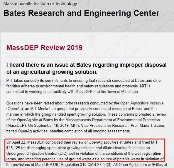 根据核能科学实验室(Laboratory for Nuclear Science)以及 Bates 研究与工程中心主任 Boleslaw Wyslouch 于 5 月 11 日致 Bates 社区的信来看,马萨诸塞州环境保护部(MassDEP)已于 4 月 22 日结束了对 OpenAg 活动的审查。Wyslouch 表示:MassDEP 处罚 MIT 是因为它将使用过的植物生长液和稀释的清洗液排入了地下排放控制井,这违反了地下井登记条款的相关规定。