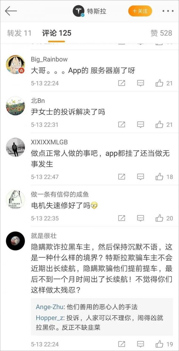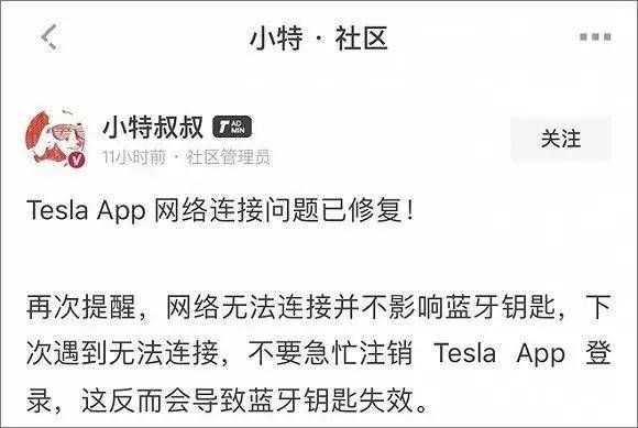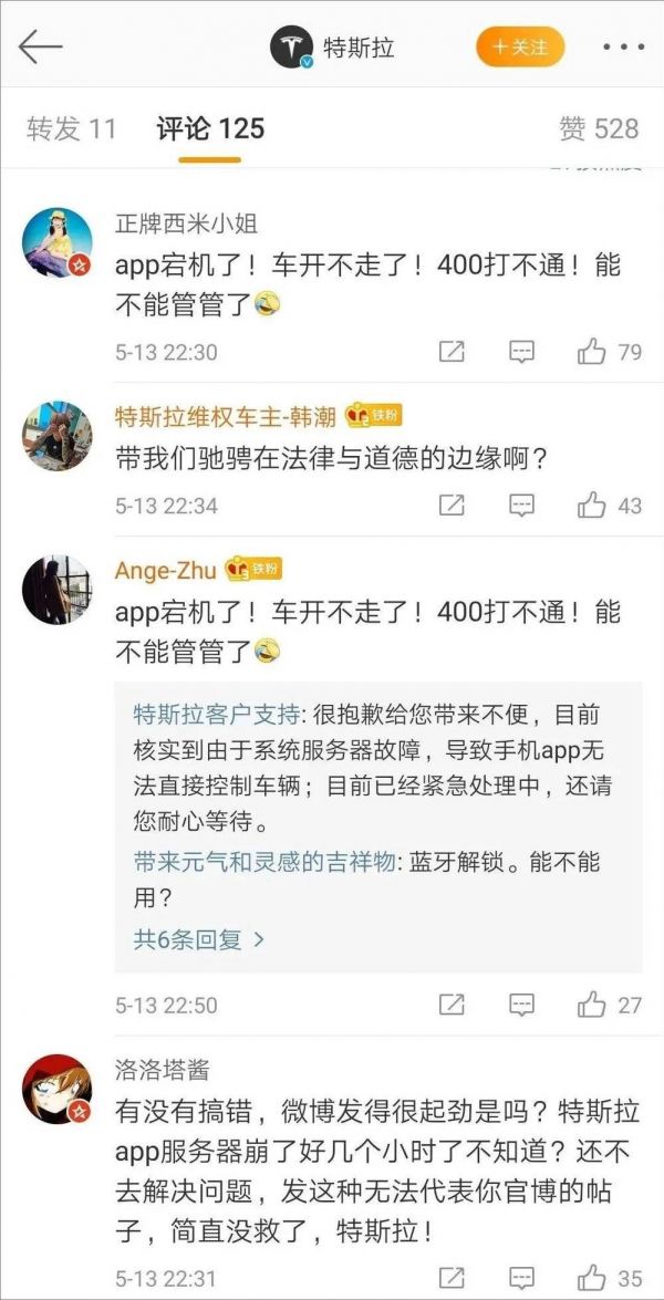 直到晚上23点40分,才有一名为“特斯拉客户支持”的微博帐号在评论区给网友留言,表示问题修复完成。