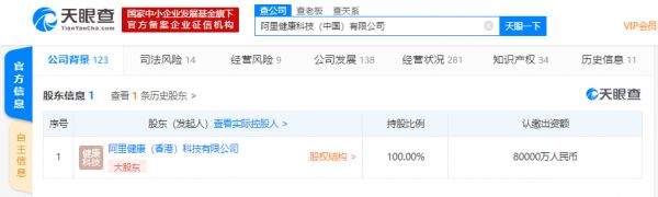 阿里健康科技(中国)有限公司成立于2015年8月,注册资本8亿人民币,公司经营范围包括医院管理(不含诊疗服务);批发医疗器械I类;计算机技术转让、技术咨询、技术服务;企业管理咨询等,该公司工商登记的股东信息显示,阿里健康(香港)科技有限公司为其全资股东。