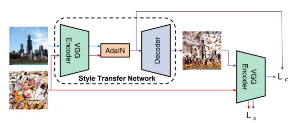 当然,这种方案的代价也是巨大的,每一组不同的content到style的转换,都需要训练一个专用的神经网络,这在实际的应用当中显然是不现实的。2017年的另一篇论文《Arbitrary Style Transfer in Real-time with Adaptive Instance Normalization》(AdaIN)[15]则对此问题做出了回应。这篇文章证实了一个至关重要的结论:style信息隐藏在特征层中每一层的统计量中(也就是每一层的均值μ和标准差σ)。故而,文章通过定向改变Instance Normalization(IN)层后特征的均值以及标准差,来获取风格迁移效果。这个方法只要通过训练一次网络,即可以实现任意content至任意style的风格迁移。