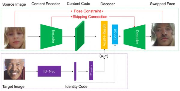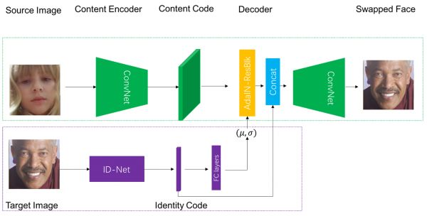 然而在实际操作中,我们注意到了以下两个问题:I)训练网络时的收敛速度很慢;II)容易产生人工造成的不自然缺陷(artifacts)。这两个问题让我们重新反思换脸问题的本质:目标人脸的ID固然可以按照style的思路注入源人脸的content中,但是这种方案很类似于传统的2D/3D视觉中的“贴脸”策略——完全采用目标人脸的ID信息而抛弃源人脸的;而要达成“换脸”,我们实际上只需要关注一个从目标人脸的ID到源人脸ID信息的变化。