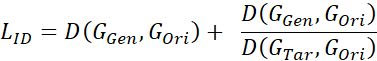 显然,终极的平衡不是调参就可以获得的。BIGO的算法同学在深挖了L_ID后发现:对于两个本来长得就有点像的人,换脸后的结果从视觉上几乎看不出变化,原因在于他们的ID特征距离本来就小,如果仅仅使用简单的l2损失或者cos相似度的话,网络对这部分的惩罚会很小,但是简单的加大L_ID的权值又会使整个网络的训练变得艰难。为了解决这个问题,我们提出了衡量换脸效果的相对ID距离。简单来说,就是对比源人脸在换脸前后与目标人脸的距离差异。用公式可以表达为: