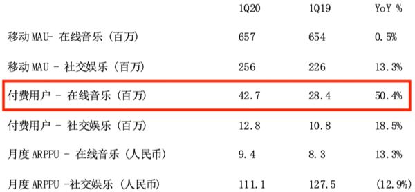 事实上就在几天后,其母公司腾讯发布的第一季度财报中,也能看到第一季度因为所谓的“宅经济”对于各式在线娱乐服务增长的带动,但身处腾讯大文娱生态中却独立上市的腾讯音乐未能跟上大势,营收增速放缓、净利润下滑以及直播业务ARPPU (平均每用户收入)下降,都让国内最大的音乐流媒体平台显得狼狈不堪。