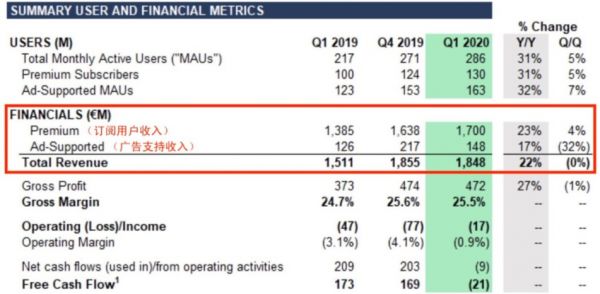 如果稍作对比便可以知道腾讯音乐在其音乐主业上有多么疲弱,而同年在美股上市的国际音乐流媒体平台Spotify,今年第一季度在全球拥有2.86亿月活跃用户,其中付费用户1.3亿,付费率超过45%,付费用户贡献的营收占公司总营收近90%。