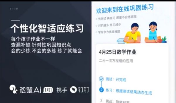 钉钉与松鼠Ai的战略合作后,松鼠Ai的产品将融入钉钉的家校本中,以AI智适应作业的形式体现,老师可以通过钉钉给学生布置智适应作业或者自定义作业,同时对学生课上学习漏洞进行补充讲解分析,实现了为每个学生提供个性化练习内容,做到因材施教。