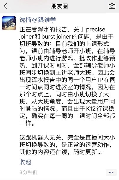 沈楠称,关于precise joiner和burst joiner的问题,是由于切班导致的:目前我们的上课形式为,课前由辅导老师开小班,在辅导老师小班内进行游戏、批改作业等预热,到开课时间时,全部辅导老师小班同步切换到主讲老师大班。因此会出现浑水报告中的同一个用户IP在同一时间点同时进教室的情况。