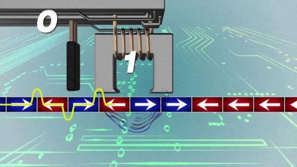 电子设备是通过电流变化来识别信息的,而电场的变化会产生磁场,反之亦然,并且方向可控。利用这种电磁感应现象,我们就可以改变磁性载体组成单元(磁畴)的磁极取向,相应地定义为0和1。