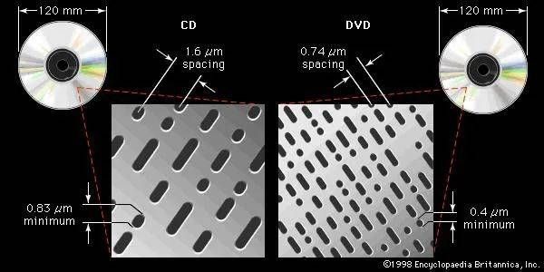 CD(左)和DVD(右)的微观结构,后者的信息密度更大 | 图源:大英百科全书