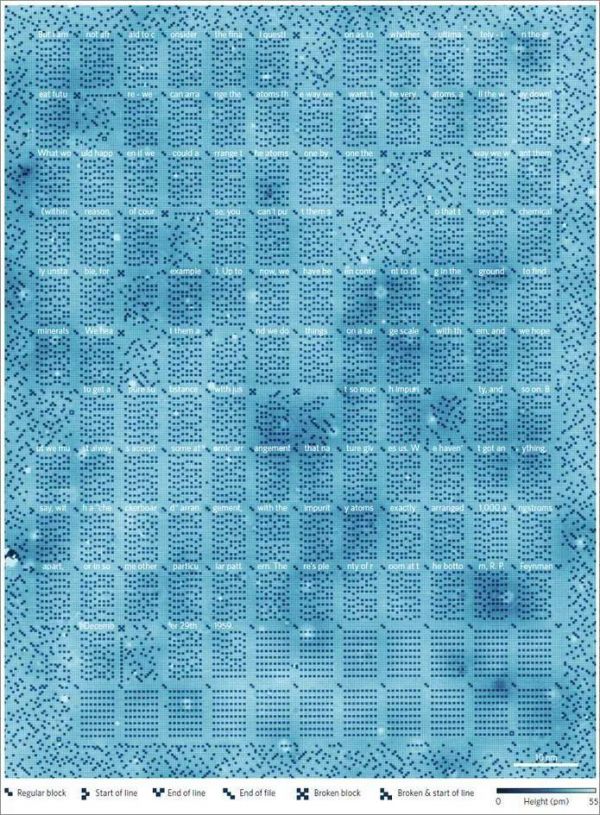 纳米尺度的硬盘上用氯原子编码了物理学家理查德·费曼演讲中的一段话 | 图源:F. E.Kalff, et al. (2016)