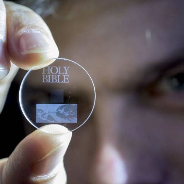 2013年,英国南安普顿大学的科学家用飞秒激光在玻璃盘的3维空间结构中打出一系列极小的点,将300KB的信息储存在其中。如今他们已经把这种玻璃盘的信息存储能力提升到了300TB!