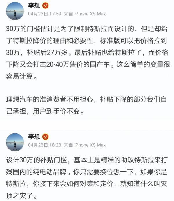 新政出台的当晚,理想汽车创始人李想连发两条微博,他指出30万的门槛估计是为了限制特斯拉而设计的,但是却给了特斯拉降价的理由和必要性,反而成为了特斯拉打残国内纯电动品牌的助攻。