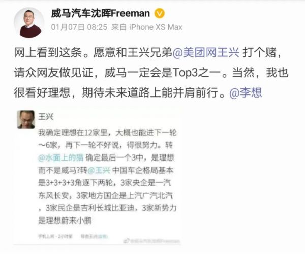 关于这几家车企究竟谁是新造车三强,王兴和威马创始人沈晖有过赌约。王兴认为,洗牌之后能留在战场上的三家新造车企业是理想、蔚来和小鹏,为此,沈晖在微博向王兴喊话:如果威马在2020年的新造车势力中销量不是头部三强,沈晖将送给王兴一辆车,品牌不限,价格不限;若威马达成目标,王兴则要给沈晖送外卖,产品和地点自选。