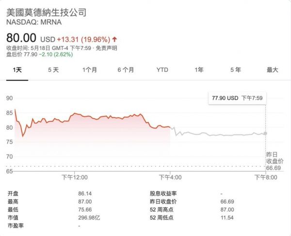 本周一,Moderna公司宣布新冠疫苗人体试验取得成功,截至北京时间5月19日上午7点59分,公司股价随即大涨20%。此消息也刺激了美股整体飙升,午盘后持续发力涨幅扩大超900点,是近一个月来的最大涨幅。