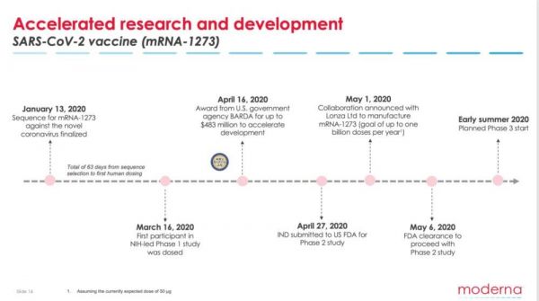 从研发进程上看,从2020年1 月份开始,Moderna就敲定了mRNA-1273的基因序列。3月16日,首位志愿者完成接种,从选择疫苗的mRNA序列到首例疫苗接种只花了63天!