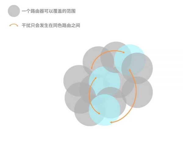 Wi-Fi 6 为了应对这一问题,将会使用 BBS 着色(BBS Coloring)的方式,来降低无线路由器/接入点之间干扰。只有相同颜色的无线路由器/接入点才会造成干扰。