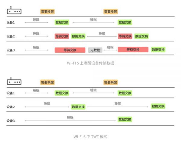 过去 Wi-Fi 协议使用的节能模式会周期性地主动唤醒设备,让设备接收存放在无线路由器/接入点缓冲区中的数据。而有些设备(比方说部分 IoT 传感器)可能不需要那么频繁的唤醒,过于频繁的唤醒反而会让它们的电池寿命缩短很多。