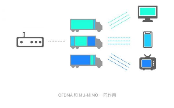 OFDMA 功能也可以打个形象的比方:物流中心给某个客户发货的时候,发现卡车没填满,老的调度系统(Wi-Fi 5)会选择直接发货,然后再给下一个客户发货,下一个客户同样没填满卡车,依次往复;而新的调度系统(Wi-Fi 6)会尝试填满整个卡车,这个卡车会一次性把所有的货物发给每个不同的客户。OFDMA 技术可以帮助设备访问互联网时大幅度减少延迟,提高传输效率。