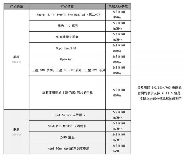 目前支持 Wi-Fi 6 的设备和相关如下图(下图仅仅只是举例):