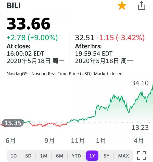 哔哩哔哩近一年股价走势,来源雅虎财经