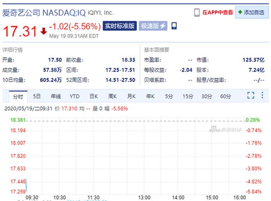 新浪科技讯 5月19日晚间消息,爱奇艺开盘跌超5%,截止发稿报17.31美元。
