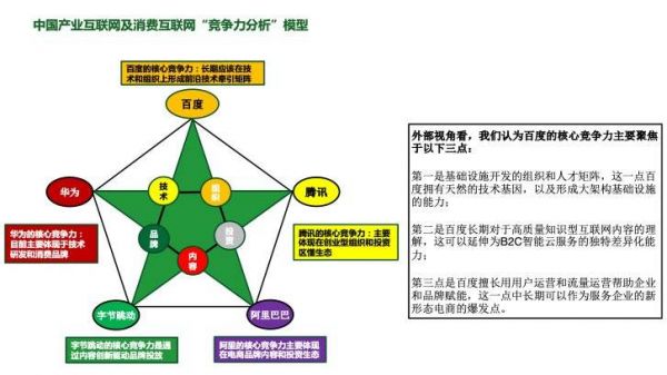 百度:结合以上分析,在这个产业互联网和消费级互联网大的竞争力分析模型中,我们看到百度是“技术”和“组织”至上的。虽然百度在投资效果方面落后于腾讯、阿里,虽然百度在内容上落后于头条,在品牌上落后于华为,但百度一直牢牢把控互联网研发型技术组织的迭代和升级。而占据了人和技术,本质上是占有了长期竞争力,这也是我们对百度并不悲观的根本原因。