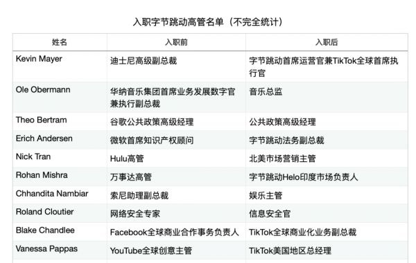 正如Xbox、PS4分区运营那样,正在海外急剧扩张的字节跳动也采用以抖音和TikTok两个产品来区分国内与国外市场,为了更好的进行本土化改造,他们将这种分区贯彻到管理团队上,到目前为止已经挖来许多各领域的头部人物,试图打造一支强大的海外管理和运营团队。