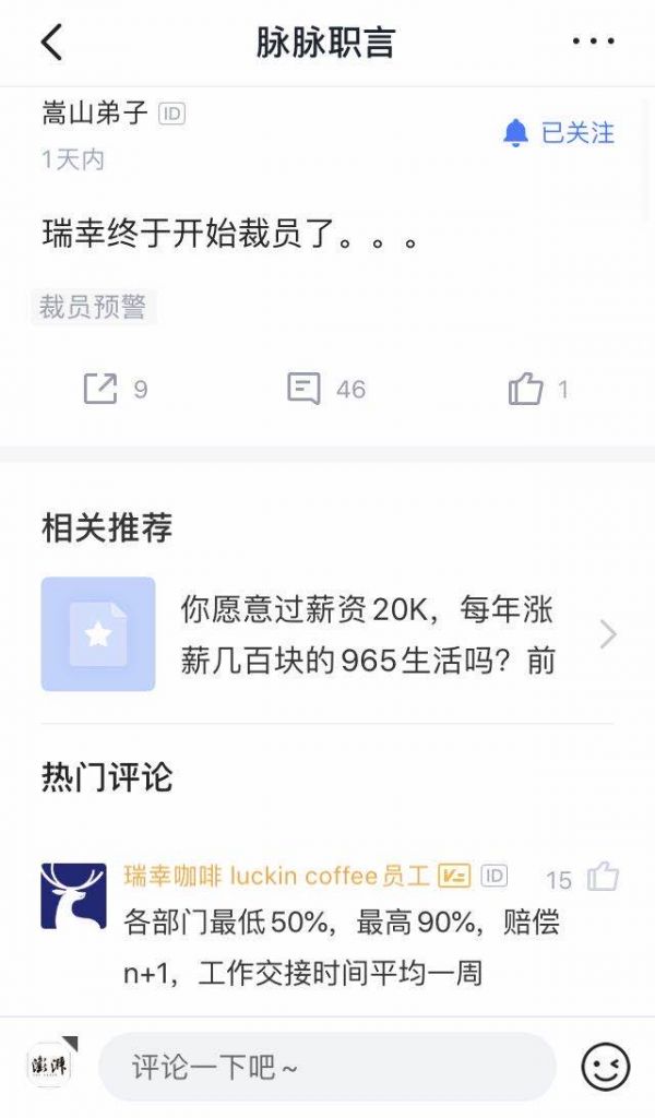 5月20日,澎湃新闻记者注意到,有瑞幸员工在某网络平台上透露,公司开始裁员,“各部门最低50%,最高90%,赔偿n+1,工作交接时间平均一周”。