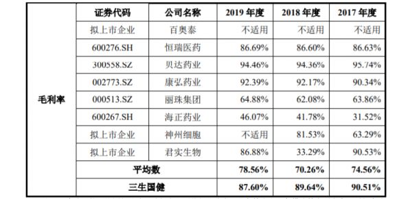 吸引36氪关注的是,三生国健具有高于行业水平的毛利率。招股书显示,三生国健2017年、2018年、2019年的毛利率分别是90.51%、89.64%、87.60% ,这个数据超过了创新药龙头的恒瑞医药,远超丽珠集团和海正药业,低于贝达药业和康弘药业。
