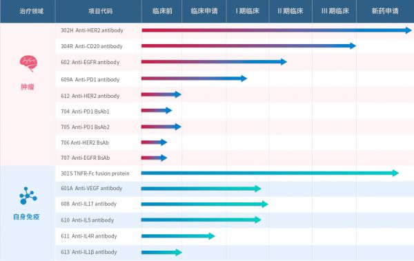 这家公司的研发管线是比较丰富的,共有15个主要在研抗体药物,涵盖肿瘤、自身免疫性及眼科等疾病领域。其中2个产品已提交上市申请、6个产品处于临床阶段,另有7个创新抗体药物处于临床前阶段。