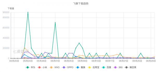 根据七麦数据提供的数据显示,飞聊的安卓端在刚上线之初,广受热捧时日均90000下载量,随即于同年6月中旬开始,日均下载量下降至20000以内。主要原因还是飞聊热度过后,没能通过自身的功能以及内容获得用户的喜爱。到目前为止,其日均下载量已经徘徊到10000。