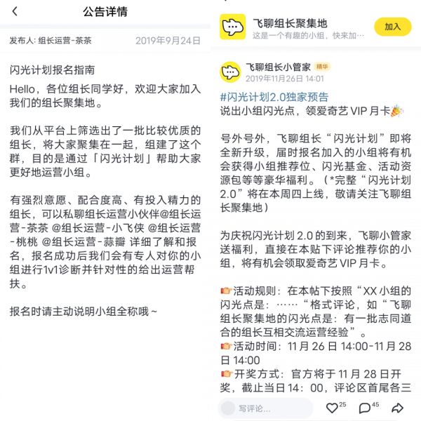 Tech星球(微信ID:tech618)独家了解到,直到去年9月,飞聊团队才开始重视这个问题。飞聊运营启动了一个名为“闪光计划”的项目,并在同年11月升级为“闪光计划2.0”。专注于培养小组组长对内容的创作和运营,也就是为组长进行流量扶持以及权力上的加持。