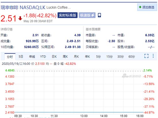 新浪科技讯 5月20日晚间消息,瑞幸咖啡开盘大跌42.82%,报2.51美元。