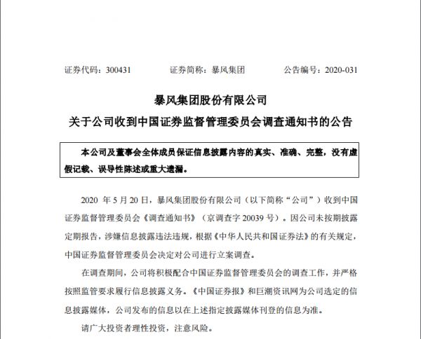 5月20日,暴风集团发布公告称,公司收到中国证券监督管理委员会《调查通知书》(京调查字20039号)。因公司未按期披露定期报告,涉嫌信息披露违法违规,根据《中华人民共和国证券法》的有关规定,中国证券监督管理委员会决定对公司进行立案调查。在调查期间,公司将积极配合中国证券监督管理委员会的调查工作,并严格按照监管要求履行信息披露义务。