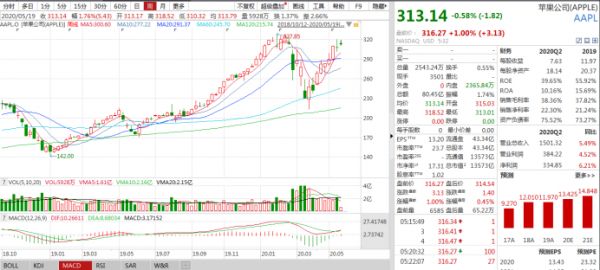 值得注意的是,尽管受疫情影响,苹果股价波动较大,但目前走出了一个V型反弹走势,逐步逼近今年以来取得的高点(327.85美元)。