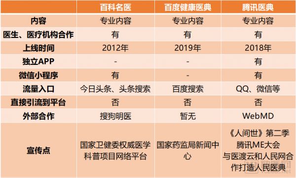 在字节跳动完成收购后,三款产品的流量入口方式基本一致,都是从自家流量平台导入。百科名医网从今日头条和头条搜索中获取流量;百度健康医典主要通过百度搜索获取流量;腾讯医典则从微信或QQ搜索入口获取流量。而且三家都不直接将流量导入医典平台上,流量仍然留存在原平台。