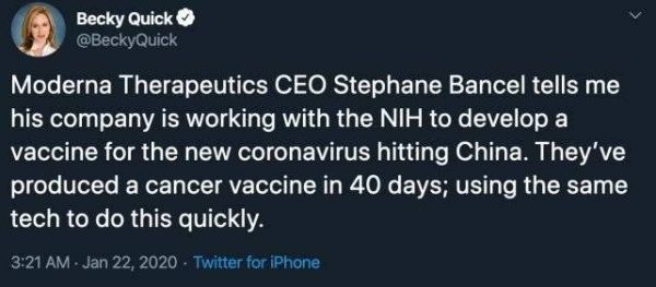 这家公司首次进入更多大众视野的,是其在今年1月份对外高调宣布进行新冠疫苗研发的消息,在当时接受财经电视CNBC采访时,公司CEO Stephane Bancel称,已经与美国医疗机构合作。负责这次采访的CNBC主持人Becky Quick在个人推特上称,“该公司过去曾在40天内研发完成癌症疫苗,正在用同样的技术快速地做(新型冠状病毒疫苗的研发)。”
