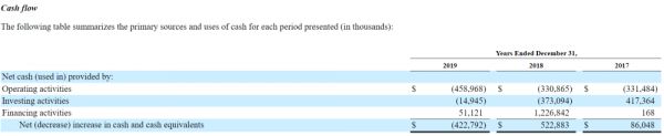 根据Moderna 2019年财报显示,从2017年至2019年,公司总亏损分别为2.7亿、4.0亿和5.1亿美元,该公司在三年期间融资总额达到13亿美元,同时,用于运营相关的现金净流出高达12亿美元,基本上融资所用的资金全部用于支持业务运营。