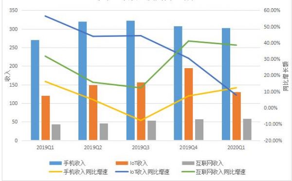 (小米手机、IoT、互联网收入,及其同比增速,数据来源为财报,36氪制图)