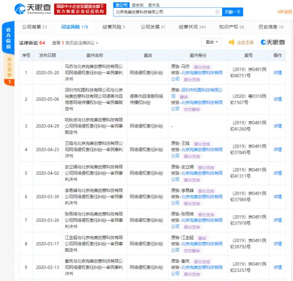网易科技讯5月21日消息,天眼查数据显示,昨日北京完美创意科技有限公司新增一条法律诉讼信息,判决书案由为网络侵权责任纠纷,原告为马苏。