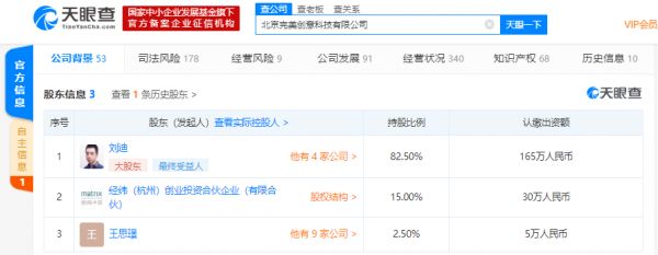 天眼查股权结构显示,公司最大股东为创始人刘迪,持股比例82.50%;经纬中国旗下的经纬(杭州)创业投资合伙企业(有限合伙)持股15.00%,为公司第二大股东;更美APP联合创始人王思璟持股2.50%,为公司第三大股东。