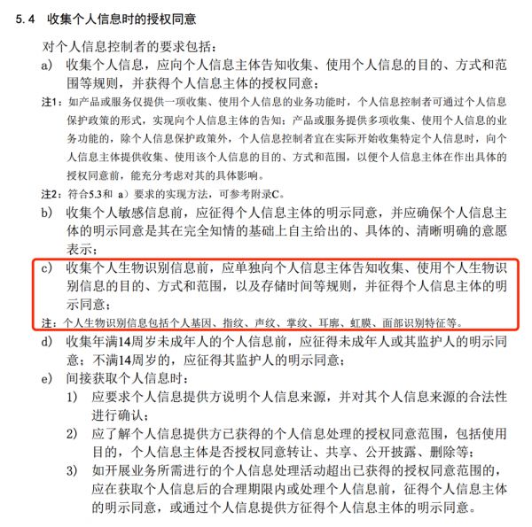 比如根据新版《规范》要求,在收集人脸、指纹等个人生物识别信息前,应单独向个人信息主体告知收集、使用个人生物识别信息的目的、方式和范围以及存储时间等规则,并征得个人信息主体的明示同意。也就是对于收集个人信息者提出“单独告知”及“取得明示同意”的双重要求。