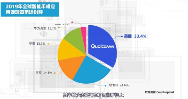 2019年,高通芯片业务营收超过146.39亿美元,移动处理器出货量为6.5亿个,其中绝大多数用在了智能手机上,占据全球超1/3市场份额。