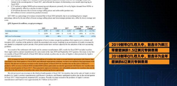 在不计算苹果和解费的前提下,2019年,高通的QTL业务总营收45.91亿美元,税前利润29.54亿美元,利润率高达的64.34%。