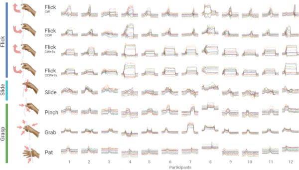 参与者还通过排名和评论提供了定性反馈,参与者还提出了多种交互方式,包括滑动、弹指、按压、捏、拉、挤等。