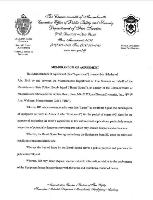 马萨诸塞州警察局与波士顿动力公司的合同被曝光