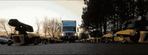 并排站队的机器狗大军,拉货车的样子像极了雪橇犬在雪地奔跑拉人。从图中也可以看到,Spot们有组织、有纪律,能够完成任务的难度系数也要比雪橇犬们高得多。
