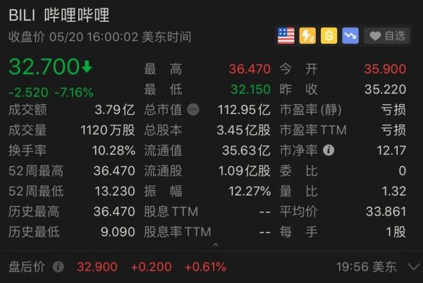 昨日晚间,B站股价在开盘时延续着财报发布之后的势头涨到36.34美元/股,但迅速开始一路下跌,截止收盘时跌幅高达7.16%,股价最终稳定在32.7美元/股。一夜之间,B站的市值较前一日收盘缩水了8.7亿美金,约61亿元人民币。