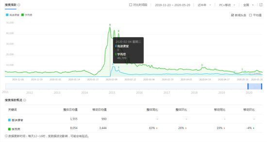但令人诧异的是,百度指数显示,在2020年2月4日之前,关键词“高途课堂”的搜索指数始终为0。十分巧合的是,这一天也是“学而思”历史搜索指数最高的一天。在这天,教育部发布了《在疫情防控期间做好普通高等学校在线教学组织与管理工作的指导意见》,对高等学校停课不停教、停课不停学作出了9条措施安排。正是教育部的这一动作,使得在线教育应用火爆起来。